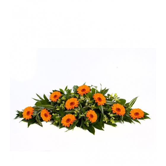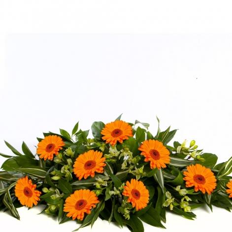 Germinis in autumn colours make this a “glowing” tribute, designed in Oasis with combinations of quality foliage and seasonal Alstromeria.
