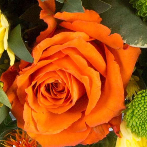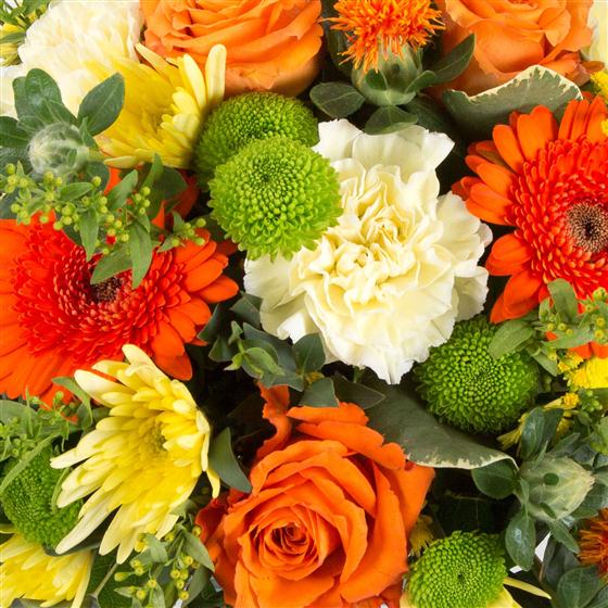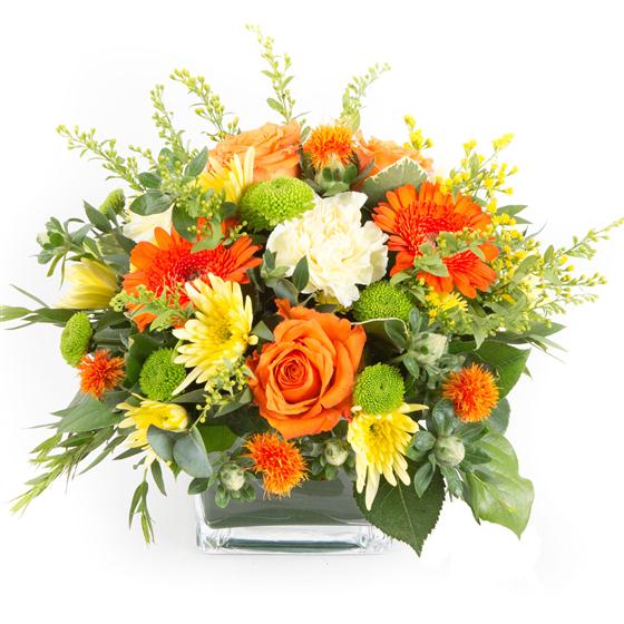 A delightful flower arrangement made in a cube shaped ceramic vase in shades of orange and yellow with a touch of lime.