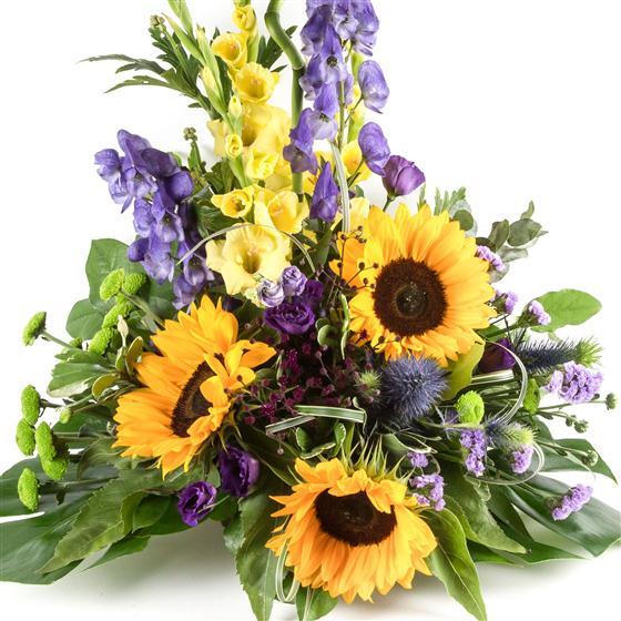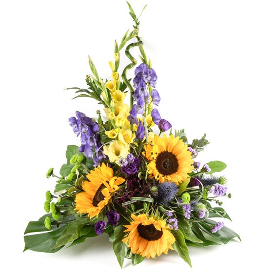 A magnificent arrangement of bright yellow sunflowers, gladioli, aconitum and lime green chrysanthemums.