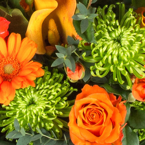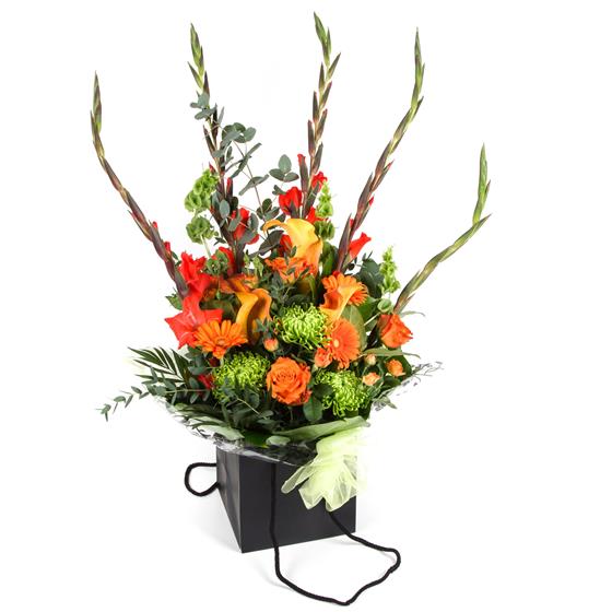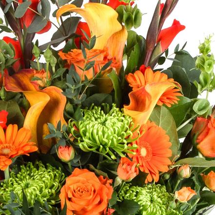 A lavish gift of exotic orange and lime blooms with combinations of other lovely flowers in tones of orange and autumnal colours. This item comes in a ceramic vase for immediate presentation and display.