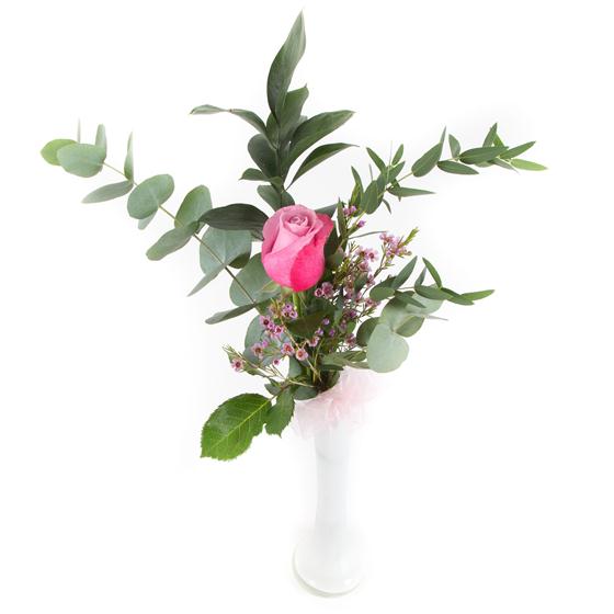 A single long stemmed quality pink Rose with mixed foliage in an elegant vase. Gift wrapped.