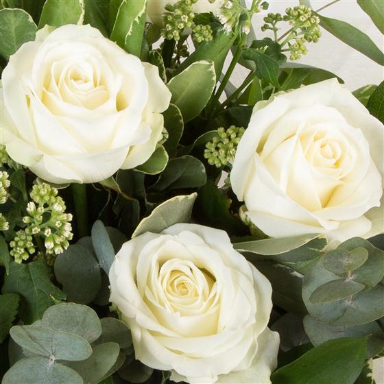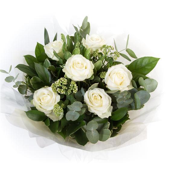 Six top of the range long stemmed large head cream roses spiralled, hand-tied with quality foliage in water bubble to create this elegant bouquet.